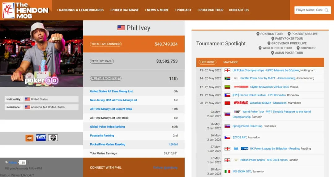 找到牌手后,你可以查看他们的数据,包括现场赛事总收入、最高现场赛事奖金、在不同榜单的排名、完整结果列表等等。例如,Phil Ivey 的个人资料如下。