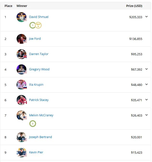 Shmuel在决赛日全程保持专注:"去年在PLO8赛事止步17名,今年我告诉自己必须走得更远。比赛期间我从未全下,靠正确决策和一点运气走到了最后。"