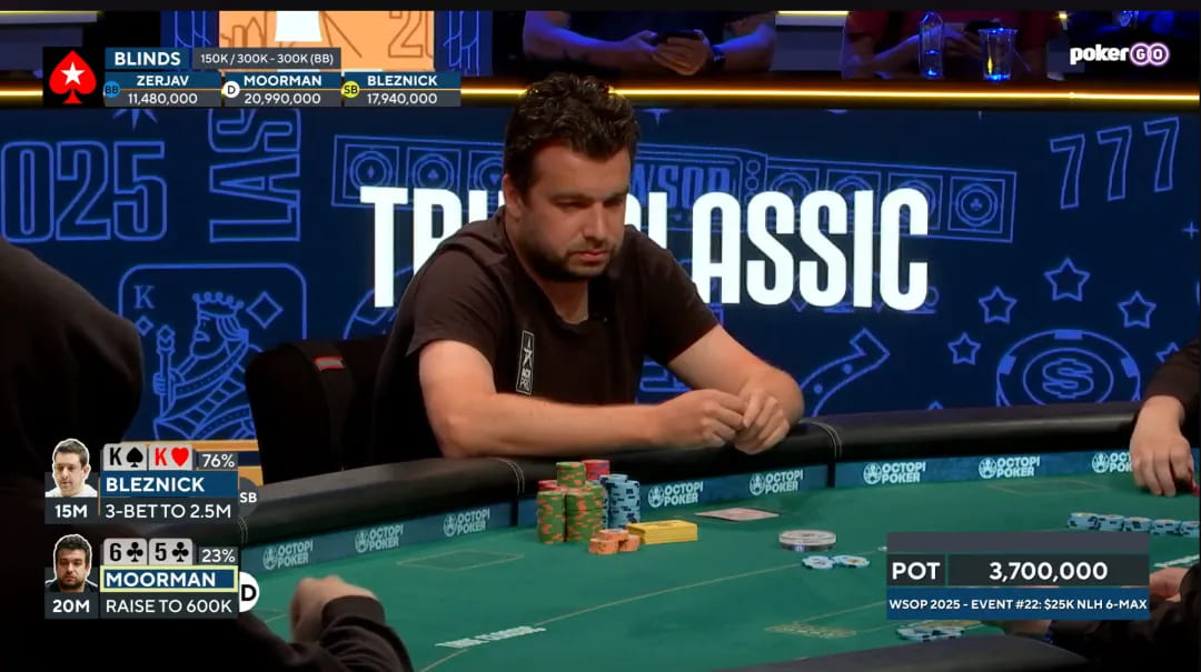 进入FT决赛桌Moorman一度势如破竹,势不可挡。包括三人桌时70bb 56s在3bet底池转牌成顺,清掉Bleznick 60bb的KK。Moorman以4:1的筹码比优势进入HU单挑。