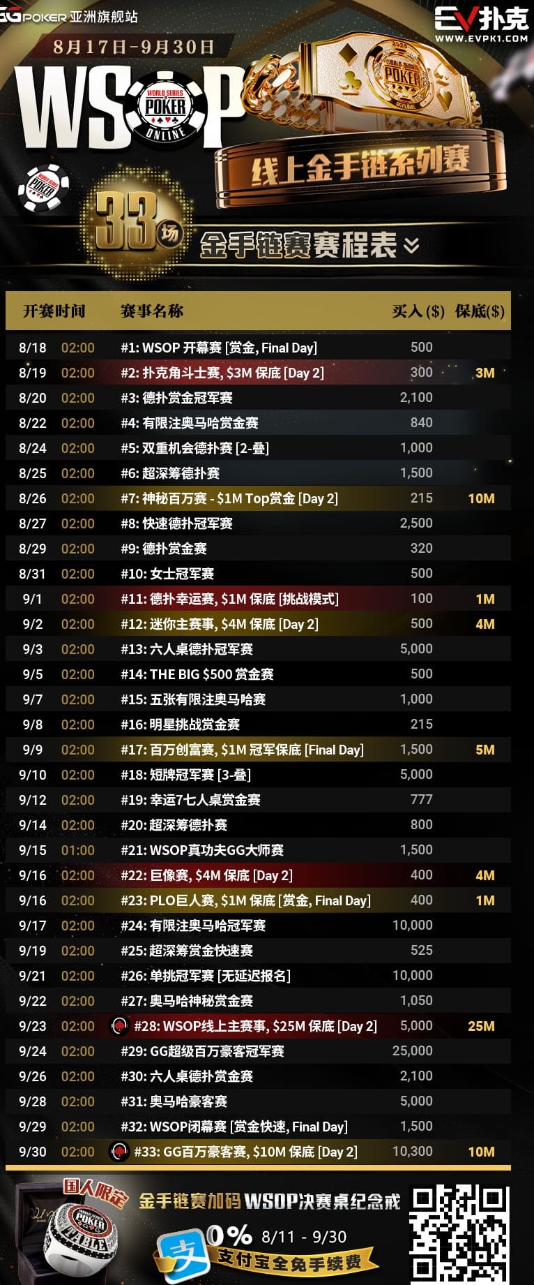 你准备好为金手链而战了吗?2025年最受期待的线上扑克盛典——《GGPoker WSOP线上金手链系列赛》8月17日-9月30日重磅开打,共33条金手链等待颁发!