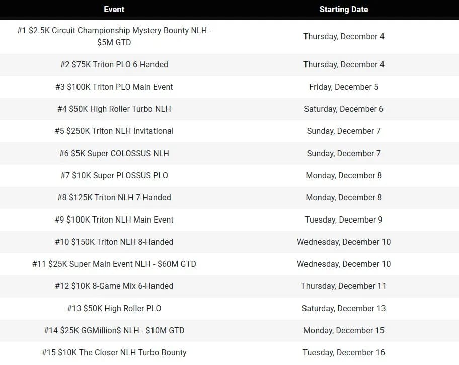 2025WSOP天堂岛站共有16场金手链赛事,其中6场与Triton Poker合作——是去年的三倍。豪客赛阵容空前强大,包括: