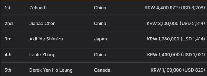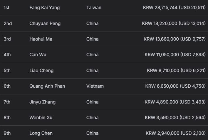 亚军由同胞Yixuan Dong获得,收获3,520,000韩币(约合2,514美元)奖励;同样来自中国的Bei Shi位列季军,获得2,270,000韩币(约合1,621美元)。
