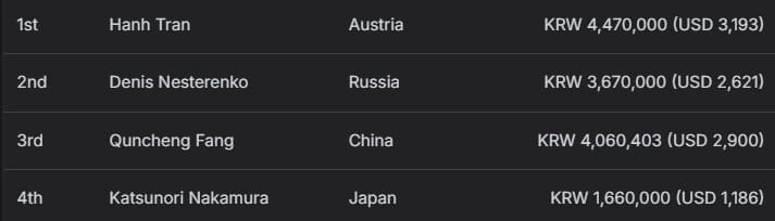 Yi Ma、Baofeng Zhang分别获得87,495,000韩币(约合62,050美元)奖励,其中Yi Ma额外收获9,250,000韩币(约合6,560美元)赏金;Baofeng Zhang则创下个人最高奖金纪录,并赢得11,000,000韩币(约合7,800美元)赏金。