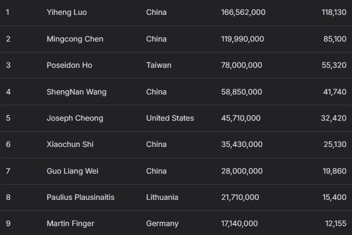 同胞Liao Cheng获得亚军,收获8,710,000韩币(约合6,221美元)奖励;Yanchao Li(近日刚在系列赛收获个人第二座APT冠军)位列季军,再次稳定输出,获得5,660,000韩币(约合4,043美元)奖金。