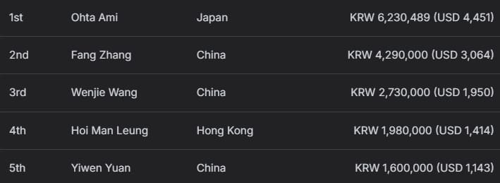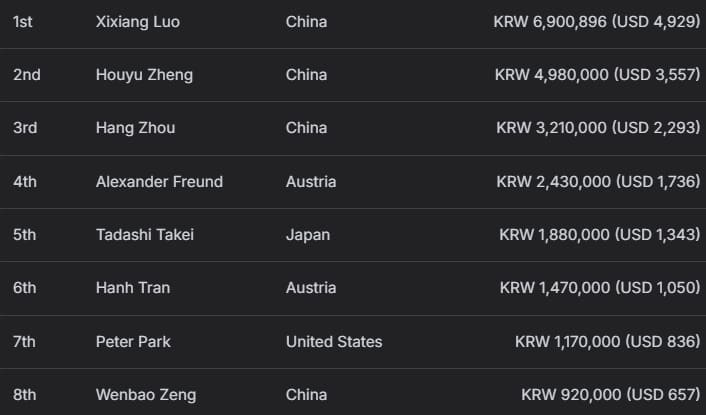 根据协议,中国选手Zhihao Zhang获得亚军及13,830,000韩币(约合9,879美元)奖励;日本选手Akihide Shimizu位列季军,获得12,270,000韩币(约合8,764美元)。