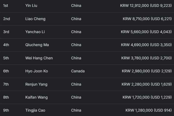 亚军由同胞Bin Wu获得,收获2,940,000韩币(约合2,100美元)奖励;另一位中国选手Songzhao Gu位列季军,获得1,870,000韩币(约合1,336美元)。