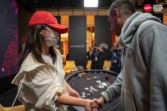 自此之后,Ceesvin展现出决赛桌统治力,先淘汰八名选手中其中五人,最终在单挑阶段,以翻牌天顺子,击败对手Lili Tang的口袋对Q,成功驯服象征至高荣誉的APT主赛事24K金狮奖杯。