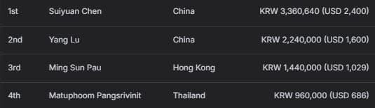 中国香港选手Hoi Man Leung获得亚军及2,960,000韩币(约合2,114美元)奖励;日本选手Shinya Ueda以1,850,000韩币(约合1,321美元)的季军成绩收官。