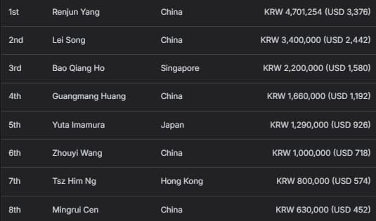 中国选手Difei Wu以14,100,000韩币(约合10,071美元)的季军成绩收官。