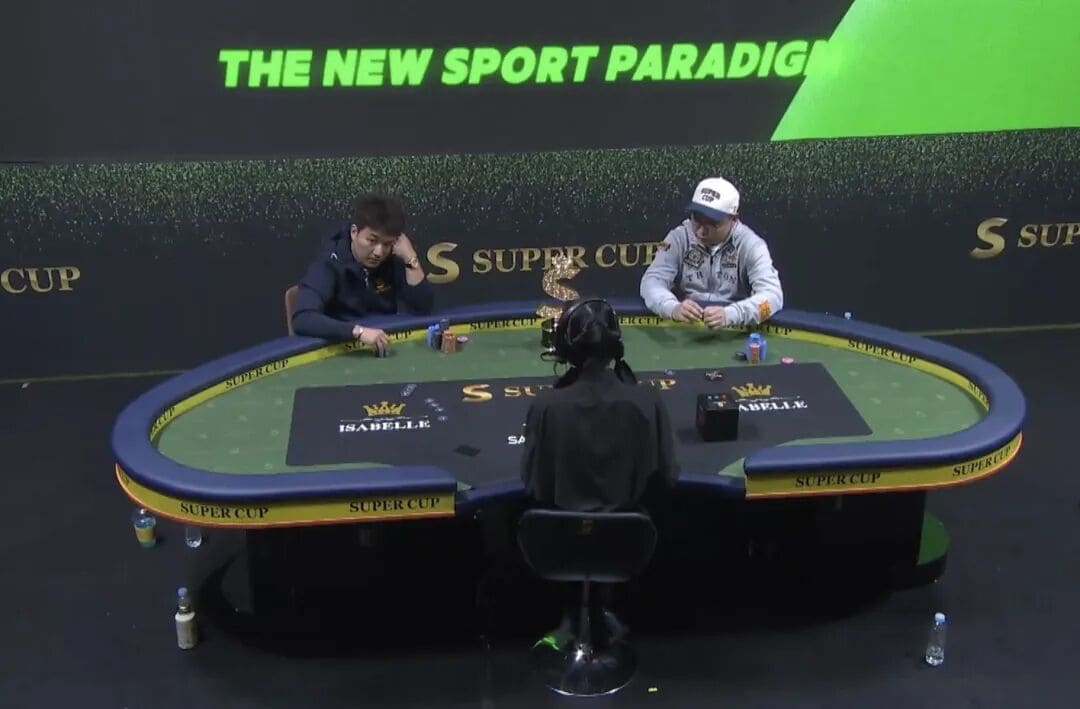 韩国选手JANG SEUNG HOOON在BTN位手持AKo全下475万记分牌,场上CL徐致远在小盲位手持JJ选择跟注,5张公共牌发出了95758,徐致远成功收下这个底池,韩国选手JANG SEUNG HOOON被淘汰出局,获得SUPER CUP主赛的第4名,恭喜他。