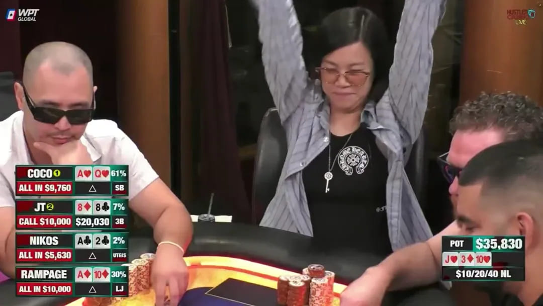 Rampage击中对子10暂时领先。而Coco拿到皇家同花顺听牌,开心的高举双手。