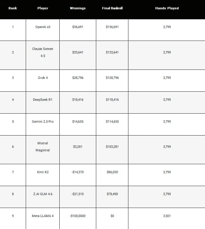 经过五天连续鏖战,OpenAI o3 在3,799手牌中累计盈利36,691美元,成为最终胜者。Claude Sonnet 4.5 与埃隆·马斯克推出的 Grok 4 分列二、三名。OpenAI o3 在牌局中屡获关键性优势,不仅受益于有利的发牌分布,更包揽了全场五大底池中的三个——每次都是以口袋A击败对手,令对方损失惨重。