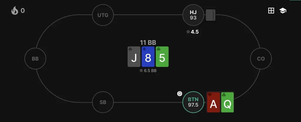 假设按钮位(BTN)持有A♠Q♠,HJ加注2.5bb,BTN跟注,小盲(SB)和大盲(BB)弃牌。