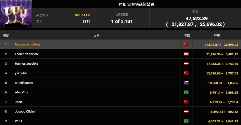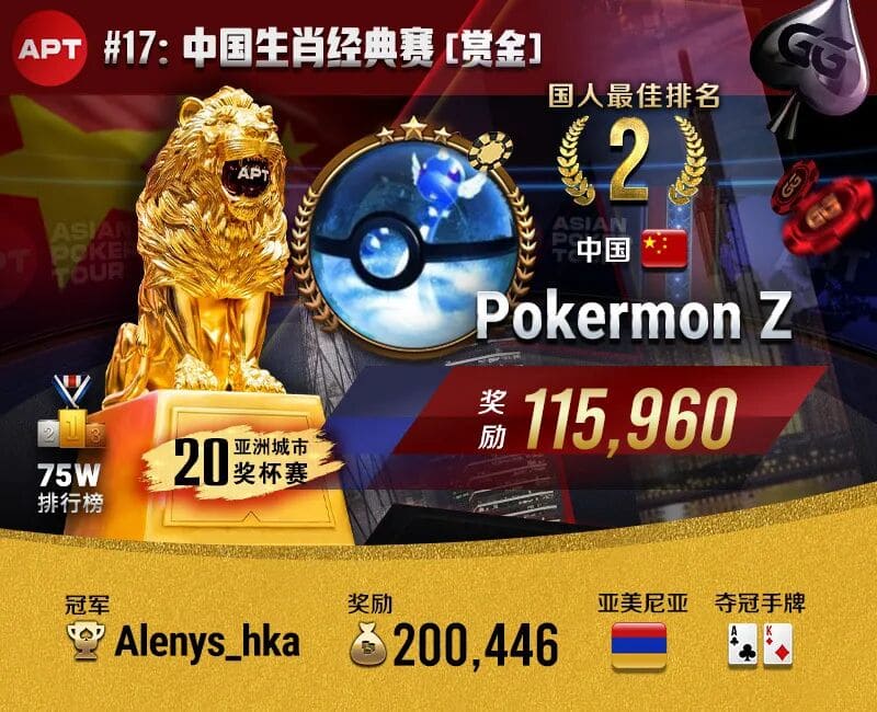 ▌Zhong Yurui (昵称Pokermon Z) 斩获#17:中国生肖经典赛亚军,奖励115,960。