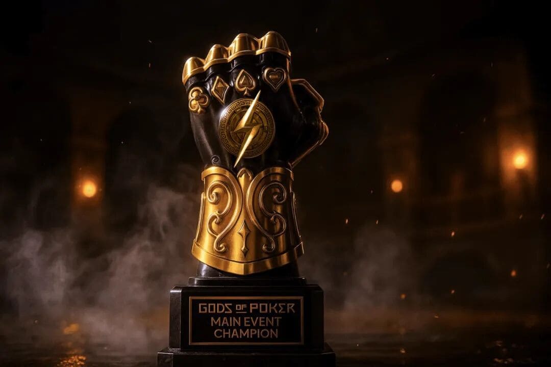 奖杯基座刻有"诸神扑克-主赛事冠军"的英文字符,庄重大气。