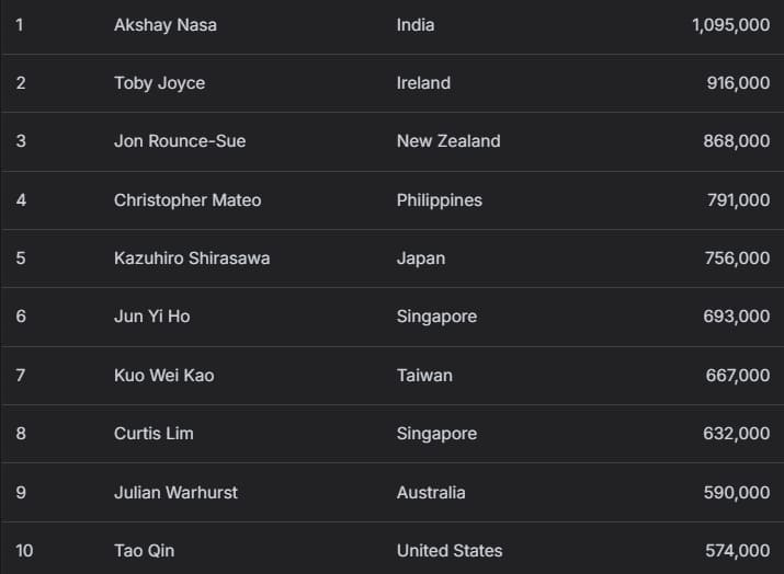 而Nasa则以1,095,000记分牌量稳居榜首,这位前APT主赛事冠军,也成为当日唯一记分牌突破七位数的选手。