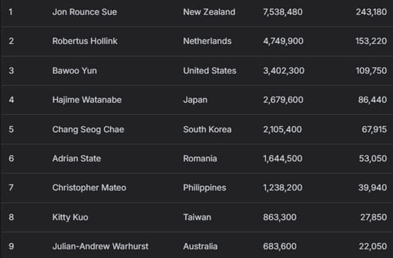 已在本届大赛收获一座冠军、两次决赛桌和一次第十名成绩的Hollink,此次再将4,749,900新台币(约153,220美元)收入囊中,使其职业生涯总奖金突破420万美元。