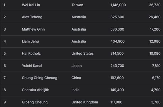 新加坡选手Kok Kong Liew以出色表现获得亚军,收获1,227,100新台币(39,703美元)奖金;日本选手Kazuhiko Yotsushika则夺得季军,将844,600新台币(27,327美元)收入囊中。