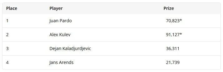 Kulev虽在双方单挑协议里获得较多奖励,但Pardo两次都在最后阶段将所有记分牌收入囊中,连续夺冠。遇到Pardo的Kulev几乎只能摇头苦笑,就问谁挡得住这种状态?