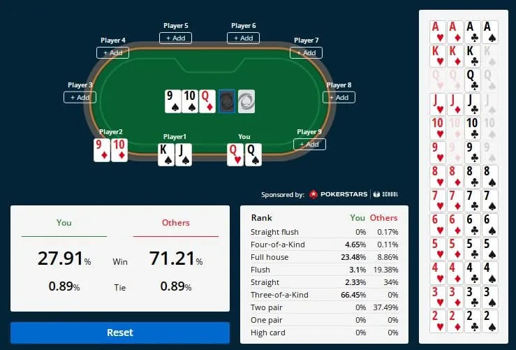 为英国玩家计算能让他获胜的补牌:牌堆中尚存一张Q,此外任何一张9或T都能助他组成获胜的葫芦。