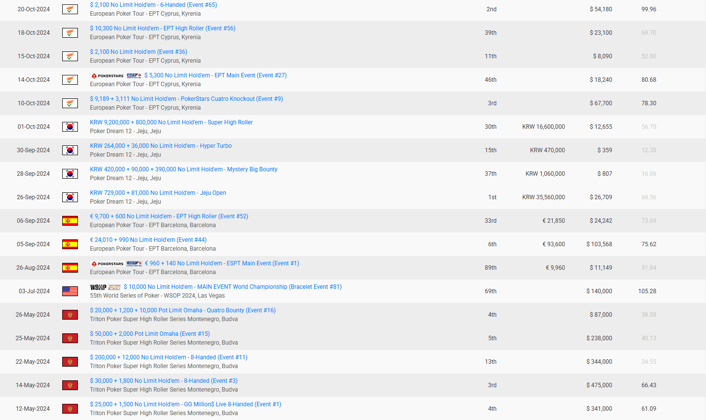 从Triton系列到WSOP,再到APT赛事,这一年,他的多次高额奖金表现、进入决赛桌以及获得冠亚军的能力,标志着他依然保持着高水平的竞技状态。