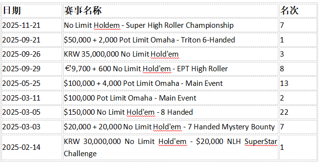 2025年是他的巅峰年份,他在多场赛事中获得7位数奖金,并屡次进入决赛桌,奖金收入和成绩均创下历史新高。