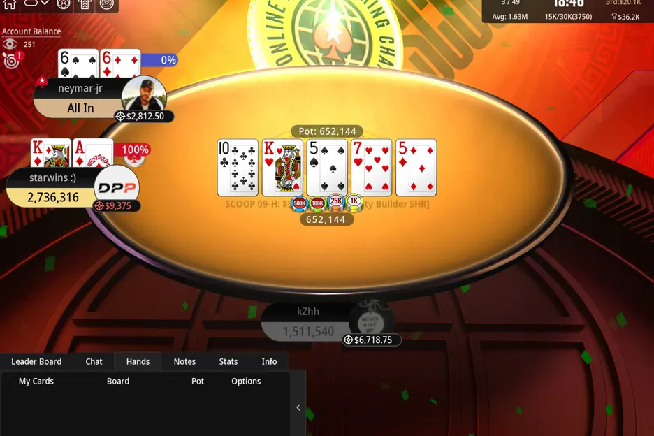 三强对决的关键时刻,内马尔手持 6♠6♦ 果断全下,迎战Petersen的 A♦K♦。翻牌、转牌,牌面干燥无波澜,内马尔的口袋对占据明显优势。胜利的曙光就在眼前,甚至有粉丝已准备好为他欢呼。