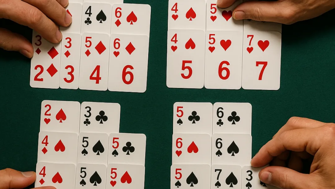 牌局进行中,玩家逐轮抽牌并依次放入各组,全程明牌——这也是“Open Face”名称的由来。