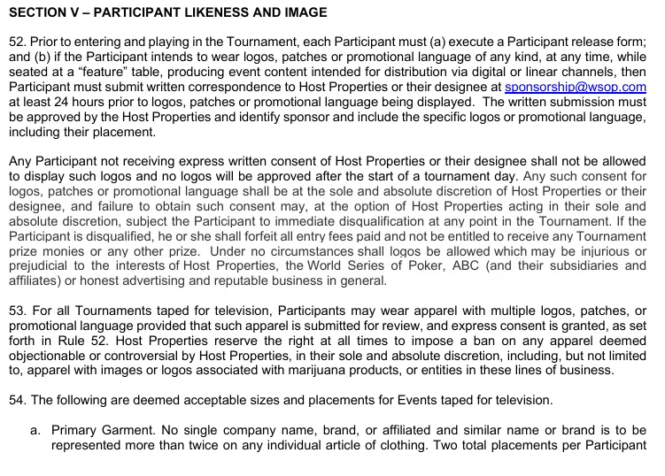 “等等,按规则52的意思——如果我们在主赛Day 1被随机选为直播桌,难道我该提前猜到,并且奇迹般地提前24小时提交审批,才能合法佩戴我的赞助商标志?”