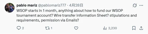 关于资金存入方式pablo mariz问: “WSOP 还有一个月就开始了,有没有关于如何往WSOP 比赛账户里存钱的信息?电汇表格?要求和邮箱授权?”