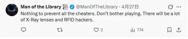 对防作弊措施的悲观看法Man of the Library直言:“没有什么能阻止所有作弊者。别费劲打了。到时候会有很多X光透视镜和RFID黑客。”