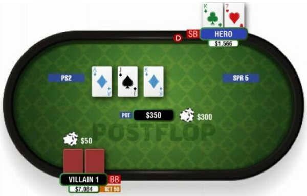 我在6人桌SNG比赛末期和对手单挑。我在按钮位置用K♣ 7♥ 加注,对手跟注,翻牌是A♦ J♠ K♦,筹码底池比是5,对手做了一个最小额度的反主动下注(PS2翻后场景):