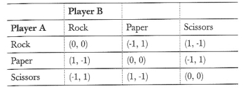 如果B想确保0期望,他可以使用{1/3,1/3,1/3}的策略。用类似计算奇数偶数游戏的方法,(可以得知)无论A选择出什么,他都会在1/3的时候赢1个单位,在1/3的时候打平,在1/3的时候输1个单位。任何其他B的选择都会导致强敌通过用一个单纯策略对抗进行剥削。所以这是该游戏的一个最优策略。