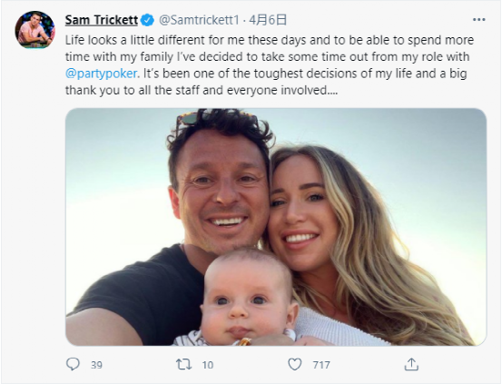 上个月,Partypoker大使Sam Trickett在推特上宣布:他将卸任大使一职、暂时离开扑克,全身心回到归家庭生活中。