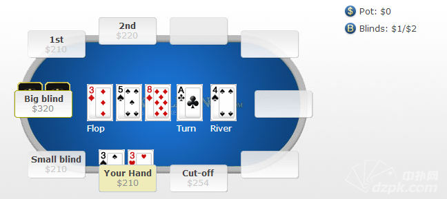 翻牌前3bet是这手牌最大的错误。口袋对子在多人底池中非常好打,所以不要在翻牌前用它3bet,这样很容易会把鱼拒之门外。你只需要跟注并希望鱼也跟着进池。这样当你在翻牌击中暗三后就能轻松赢光他的筹码了。虽然这手牌鱼做了跟注,但这毕竟是特例,你不可能总能看到鱼每次都跟注一个3bet的。所以一旦拿到适合多人底池游戏的牌型,只需跟注并鼓励后面的鱼也跟进来就好。