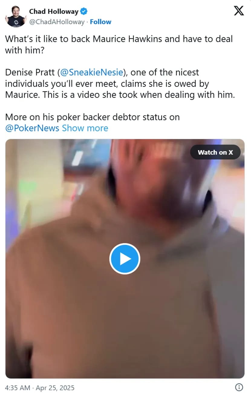 这事儿一出,WSOP金手链得主Denise Pratt也来爆料,发视频说Maurice也欠她资助协议里的钱。