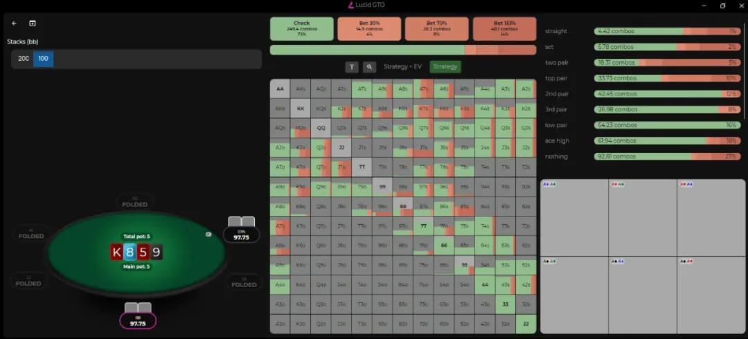 让我们看看解算器在K♥8♦5♥9♠牌面上的探听下注图表: