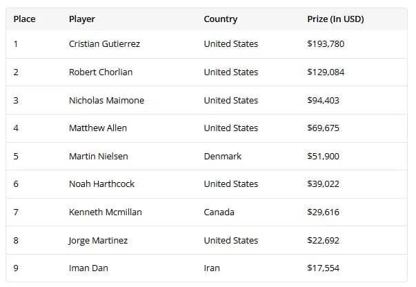 这场比赛进程迅速,昨天回归的108人已经决出了冠军。美国选手Cristian Gutierrez最终从3,110的参赛阵容中脱颖而出,获得冠军和奖金193,780美元,以及他第一条金手链。