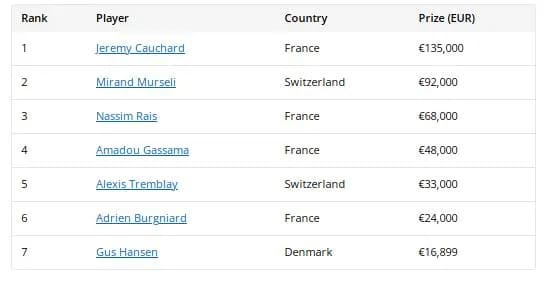 当Hansen以第七名出局时,冠军最终归属于Jeremy Cauchard。他在单挑中击败Murseli,赢得了个人第二座Winamax奖杯。Cauchard获得135,000欧元奖金,Murseli则收获了职业生涯最高的92,000欧元。