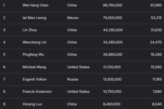 中国香港选手Chi Ngong Tang以1,398,000记分牌量领跑全场。