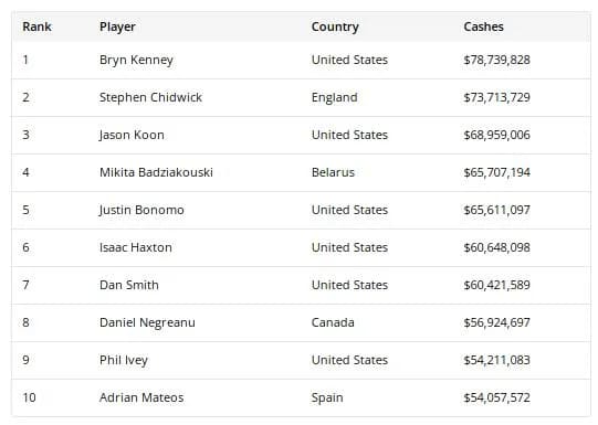 Daniel Negreanu曾一度超越由Erik Seidel保持的纪录,却在2018年被Justin Bonomo反超。随后几年,Kenney与Bonomo在榜首位置上多次交替领先。