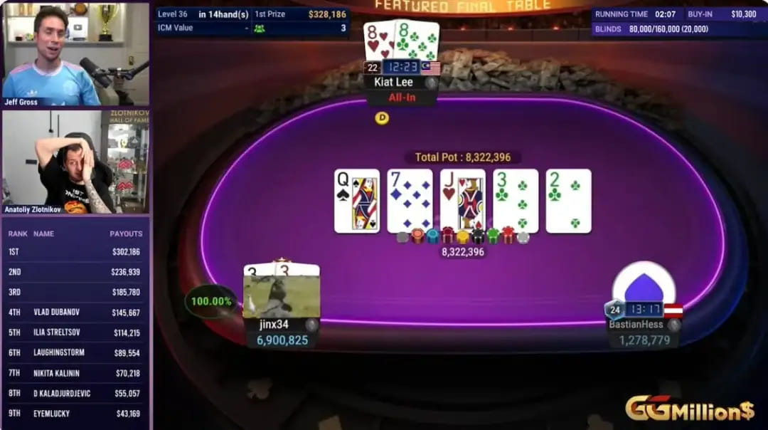 接着三人阶段时,Kiat Lee的口袋8全下又不幸输给他,这手转牌圈击中三条的逆袭也成为全场焦点。