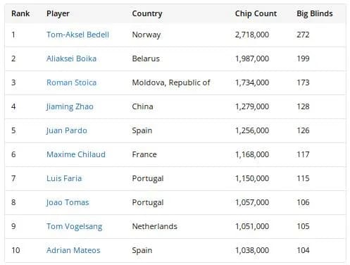 其他记分牌超过百万的选手还包括:Maxime Chilaud(1,168,000)、葡萄牙选手Luis Faria(1,150,000)和Joao Tomas(1,057,000),以及Tom Vogelsang(1,051,000),他击中“葫芦”将Enrico Camosci(第88名)淘汰出局。