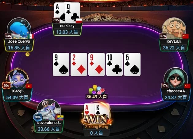 随后,他再度凭着AKs淘汰厄瓜多尔选手,除了开出3,300神秘赏金,还一举成为CL。来到三人阶段,Zixiong Peng的码量和越南选手相去不远,墨西哥选手多约15BB。