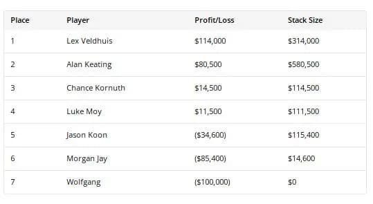 Keating在几周前本桌的第一集中开局强势,近期经历波折后,在本集成功反弹,以盈利$80,500结束。Veldhuis则继续保持领先,盈利$114,000,进入下周日播出的最终集。
