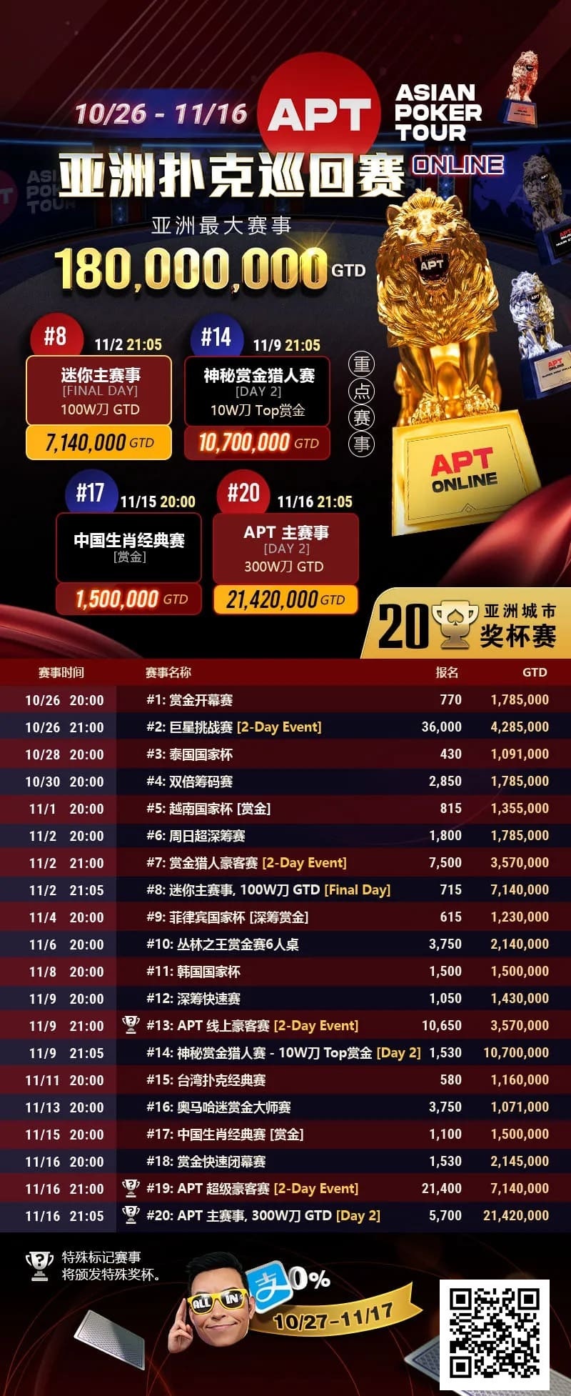 10月26日,《APT亚洲扑克线上巡回赛》再次点燃狮王之争。谁能写下属于自己的荣耀篇章?我们拭目以待!