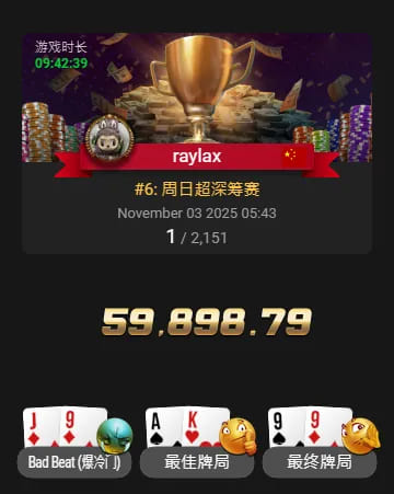 不过好景不长,最终手牌国人Shi Xiaochun口袋9成功击败对手的口袋3,顺利将比赛带走!