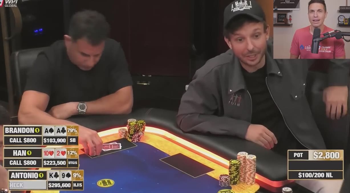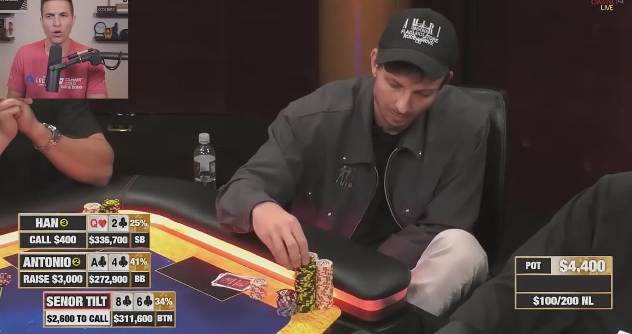 Brandon在CO位开池加注到1400。Senor Tilt(Kiki)在按钮位跟注。