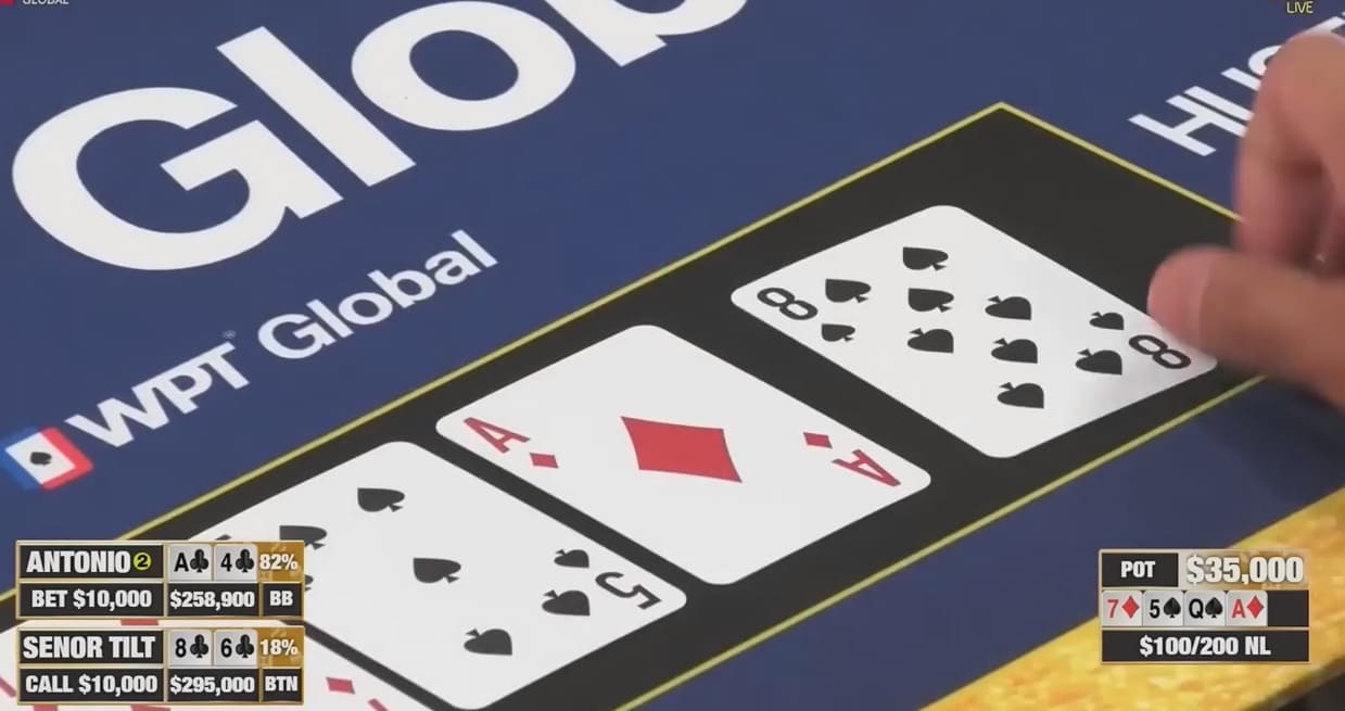 转牌发出一张A,魔术师击中顶对,一举领先。
