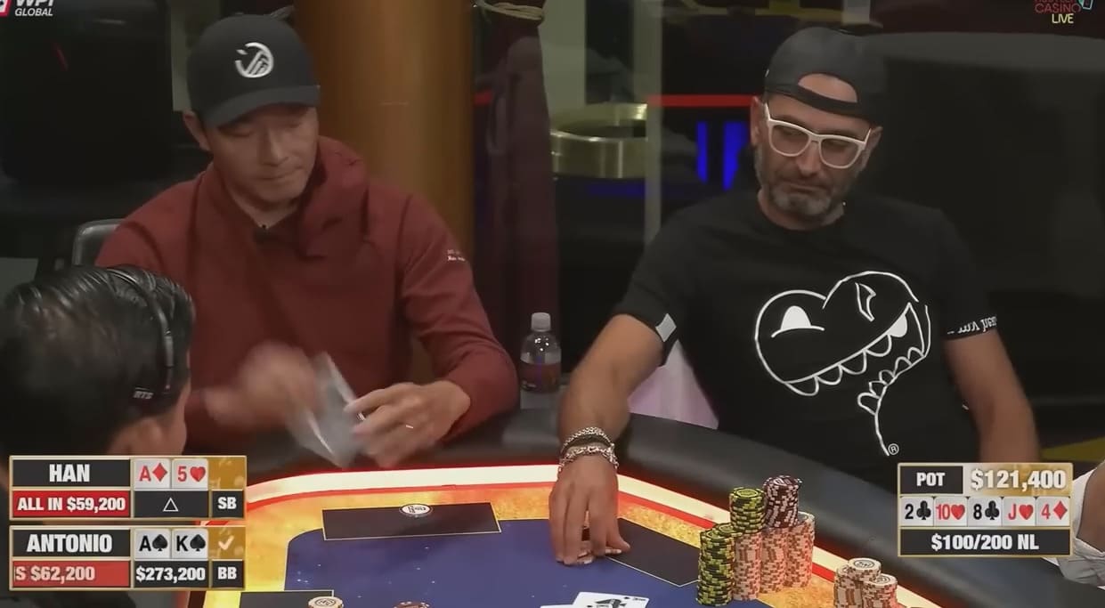 Han决定反推回去,但是魔术师不相信他有牌,跟注。